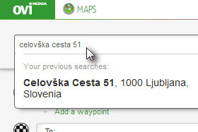 V iskalno polje sedaj vpišite naslov, kamor želite potovati. Iskalnik vam bo sproti prikazoval možne zadetke, na katere lahko tudi kliknete. |