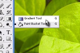 Držite z miško na orodju Paint Bucket Tool, da se vam odprejo nova orodja in potem izberite Gradient Tool. |