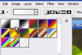 To pomeni, da boste nastavili črno in belo barvo, potem pa jih še zamenjali. Bela barva mora biti nastavljena kot primarna barva. Zgoraj v nastavitvah za Gradient Tool izberite, da se bela barva preliva v transparentno. Transparentno pomeni brez barve. |