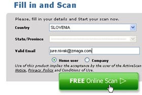 Določite državo in vpišite svoj e-poštni naslov. Potem pa kliknite na gumb FREE Online Scan. Spodaj naj bo označeno Yes, I agree to receive marketing information from Panda Software and/or its International Representatives where applicable. |