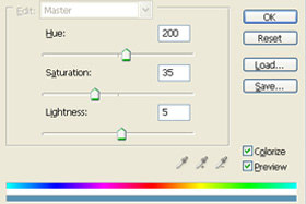 Označite Colorize. Nastavite Hue 200, Saturation 35 in Lightness 5. Kliknite na gumb OK |