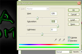 Nato pa izberite poljuben Hue in Saturation. Jaz sem izbral meni najljubšo zeleno barvo (v tem primeru je Hue 126 in Saturation 100). Kliknite na gumb OK. |