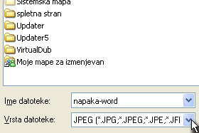 Odpre se okno za shranjevanje. V polje Ime datoteke vpišite poljubno ime. Jaz sem vpisal napaka-word. V polju Vrsta datoteke pa preko izbrinika določite JPEG. Kliknite na gumb Shrani. |