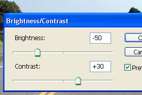 Brightness nastavite -50 in Contrast +30. Če končni rezultat ne bo zadovoljiv, potem se tukaj malce poigrajte. Kliknite na gumb OK. |