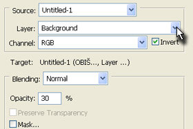 Odpre se novo okno. Layer nastavite prvotno sliko (v mojem primeru je to Background). Označite Invert. Blending nastavite Normal in Opacity na 30 %. Kliknite na gumb OK. |