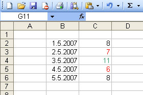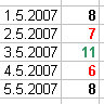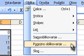 Excel je obarval vsa števila, ki so manjša od 8 v rdečo in večja v zeleno barvo.