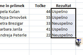 Sedaj bomo formulo hitro kopirali še na ostale celice. Držite z miško za spodnji desni vogal označene celice z rezultatom (glej sliko)... Ko boste z miško na robu označene celice, so bo prikazal črni križec. |