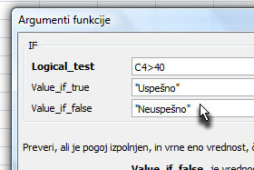 Potem pa v polje Value_if_true dopišite Uspešno in v polje Value_if_false Neuspešno.