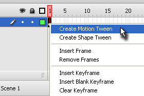 Kliknite na Frame 1 z desnim miškinim gumbom in izberite Create Motion Tween.