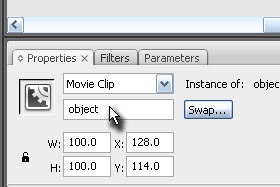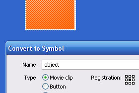 Lahko ga označite tudi z orodjem Selection Tool (bližnjica je tipka V). Pritisnite tipko F8 in v polje Name vpišite object. Označite Movie clip in kliknite na gumb OK. |