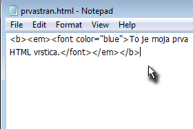 HTML lahko pišemo kar v beležnici. HTML datoteke imajo končnico .html ali .htm. Odprimo beležnico ter vanj zapišimo: