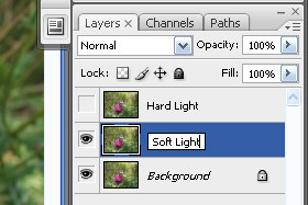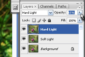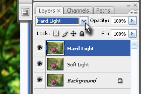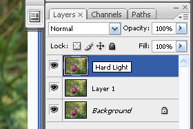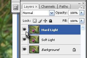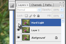 ![]() Kliknite na ikono z očesom, ki se nahaja poleg layerja Hard Light, da ga boste začasno skrili (glej sliko). |