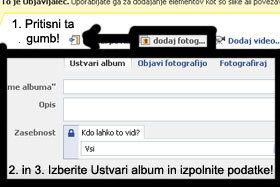 Sedaj se vam bodo odprle tri možnosti. 1. Ustvari album, 2. Objavi fotografijo in 3. Fotografiraj. Mi bomo ustvarili album. Izpolnite zahtevane podatke in pritisnite gumb Objavi. |
