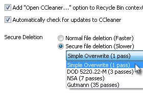 Zadnja postavka je Options. Tukaj bi jaz omenil nastavitev brisanja. Ko neko datoteko zbrišemo se ne izbriše v celoti. Pravzaprav pobriše se le informacija datoteka pa ostane (mi je ne vidimo). Obstaja pa posebno varnostno brisanje, ki datoteko "zares" izbriše tako, da jo prepiše z ničlami (prazna datoteka). Tudi v tem programu imamo to možnost. Normal file deletion - navadno brisanje Secure file deletion - varnostno brisanje Nastavimo lahko tudi, kolikokrat naj se datoteka prepiše. Predlagam 1- ali 3-kratno prepisovanje. |