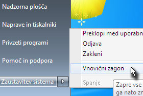 Kliknite na Start, Puščica pri Zaustavitev sistema (glej sliko) in izberite Vnovični sistem.