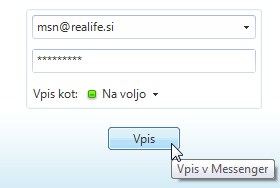 ![]() Odprite program Windows live Messenger. Vpišite podatke, ki ste jih navedli pri registraciji in kliknite Vpis. |