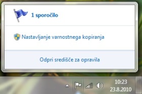 Če ste sporočila za Nastavljanje varnostnega kopiranja izklopili pojdite v Nadzorno ploščo, nato v Sistem in varnost, Središče za opravila, Vzdrževanje in potem lahko ponovno vklopite sporočila za varnostno kopiranje. Ali pa preprosto kliknite na Odpri središče za opravila (zastavica na desni strani opravilne vrstice, blizu ure).