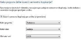 Nastavite si ali želite, da varnostno kopiranje poteka po urniku, nato pa določite kako pogosto, kateri dan in ob kateri uri naj se varnostno kopiranje izvaja.