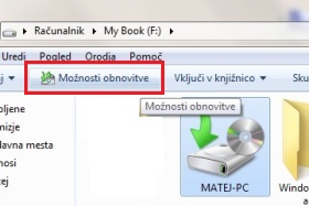 Kliknimo na ikono, ki je prikazana na sliki in nosi ime našega računalnika, ter izberimo Možnosti obnovitve.