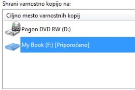 ![]() Jaz sem izbral zunanji trdi disk. Sistem nam tudi priporoča na kateri zapisljivi medij naj naredimo varnostno kopijo, tako da poleg napiše [Priporočeno].