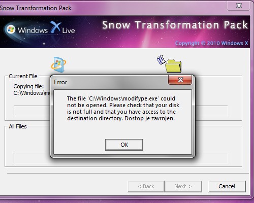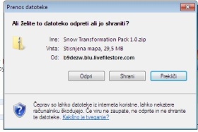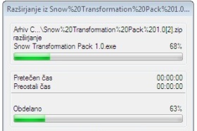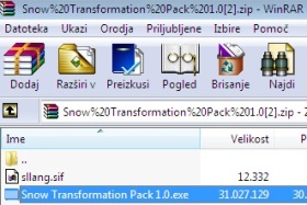 ![]() Razširite in zaženite program Snow Transformation Pack 1.0.exe, ki ste ga prej prenesli in kar direktno odprli z Internet Explorerjem. Če ste delali z drugim brskalnikom, arhiv odprite ročno. Program Snow Transformation Pack 1.0.exe razširite in zaženete tako, da dvakrat kliknete nanj. |