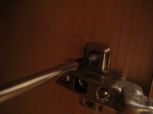 V mojem primeru se mi zgornji vijak s časom zrahlja in se mi vrata omare ponovno ne zapirajo dobro. Zato ga bom odvil. |