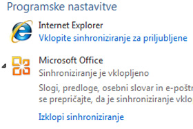Za vklop sinhronizacije kliknite na Vklopite sinhroniziranje pri posameznem programu, za izklop pa je potrebno klikniti na program, da se odpre možnost Izklopi sinhroniziranje.