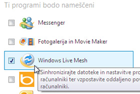 Kliknite na naslednjo povezavo in prenesite namestitveno datoteko brezplačnega paketa programov Windows Live Essentials, v katerem je tudi Mesh: http://explore.live.com/windows-live-mesh