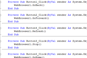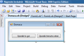 WebBrowser1.GoBack() "Naprej": WebBrowser1.GoForward() "Osveži": WebBrowser1.Refresh() "Stop": WebBrowser1.Stop() "Domov": WebBrowser1.GoHome() Tukaj bomo potem še nekaj dopisali. "Išči": WebBrowser1.Navigate() Če vas zanima razlaga poglejte tule. |