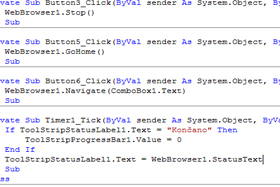 If ToolStripStatusLabel1.Text = "Končano" Then ToolStripProgressBar1.Value = 0 End If ToolStripStatusLabel1.Text = WebBrowser1.StatusText (Razlaga: Če bo ToolStripStatusLabel1.Besedilo="Končano" potem bo ToolStripProgressBar1.vrednost=0 konec če. ToolStripStatusLabel1.text bo Lokacija Webbrowser1) Če kaj ne boste razumeli, pišite na forum... |