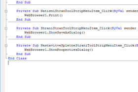 WebBrowser1.Print() (Razlaga: WebBrowser1.Tisk) Kliknite na "Datoteka" in na "Shrani stran" ter vpišite: WebBrowser1.ShowSaveAsDialog() (Razlaga: WebBrowser1.PokažiShraniKotDialog) Kliknite na "Nastavitve spletne strani" ter vpišite: WebBrowser1.ShowPropertiesDialog() (Razlaga: WebBrowser1.PokažiNastavitveDialog) Če kaj ne boste razumeli, pišite na forum... |