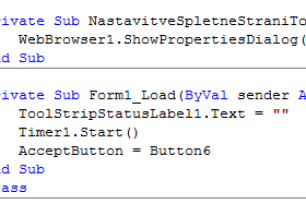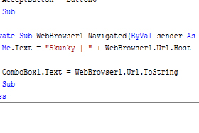 Private Sub WebBrowser1_Navigated(ByVal sender As Object, ByVal e As System.Windows.Forms.WebBrowserNavigatedEventArgs) Handles WebBrowser1.Navigated Me.Text = "IME | " + WebBrowser1.Url.Host ComboBox1.Text = WebBrowser1.Url.ToString End Sub Če kaj ne boste razumeli, pišite na forum... POZOR: Skopirajte vse in v okencu za kode dvakrat kliknite enter in skopirajte. "IME" lahko spremenite vendar pustite tisto črtico in presledek. |