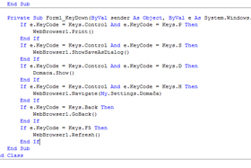 Private Sub Form1_KeyDown(ByVal sender As Object, ByVal e As System.Windows.Forms.KeyEventArgs) Handles Me.KeyDown If e.KeyCode = Keys.Control And e.KeyCode = Keys.P Then WebBrowser1.Print() End If If e.KeyCode = Keys.Control And e.KeyCode = Keys.S Then WebBrowser1.ShowSaveAsDialog() End If If e.KeyCode = Keys.Control And e.KeyCode = Keys.D Then Domaca.Show() End If If e.KeyCode = Keys.Control And e.KeyCode = Keys.H Then WebBrowser1.Navigate(My.Settings.Domača) End If If e.KeyCode = Keys.Back Then WebBrowser1.GoBack() End If If e.KeyCode = Keys.F5 Then WebBrowser1.Refresh() End If End Sub Če kaj ne boste razumeli, pišite na forum... |