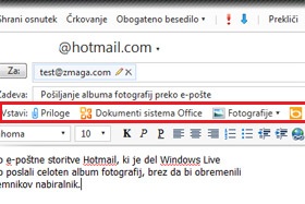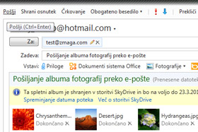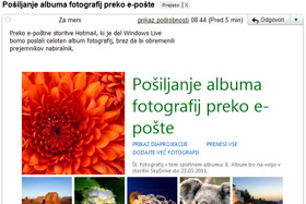 Prejemnika pa bi v nabiralniku moralo pričakati tako e-poštno sporočilo, kot na sliki, s predogledom slik in možnostmi: Prikaz diaprojekcije (za to je potreben vtičnik Silverlight), Prenesi vse (potreben vpis v Windows Live) in Dodajte več fotografij (če ste mu to možnost omogočili).