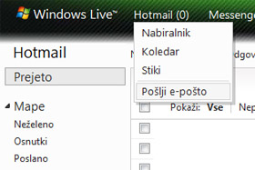Pridržite miškin kazalec nad napisom Hotmail in izberite Pošlji e-pošto. Lahko tudi kliknete na Novo, pod tem napisom, v kolikor ste že v nabiralniku. Bližnjica na tipkovnici je CTRL+N.