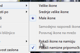 ![]() Z desnim miškinim gumbom kliknemo na prazen prostor na Namizju ter v prikazanem meniju izberemo možnost Pogled -> Male ikone. |