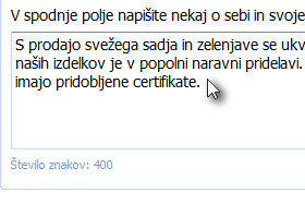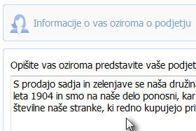 Na novi strani v prvo polje vpišite nekaj o vas, vašem podjetju, koliko časa ste že aktivni pri vašem poslu in karkoli, ki bi vas dodatno predstavilo.