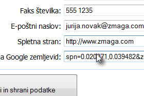 Postavite se nazaj v okno, kjer vpisujete podatke v vaš profil, kliknite v polje Povezava na Google zemljevid in pritisnite tipki Ctrl + V, da prilepite kopirano povezavo.