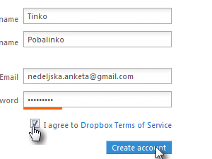 Z miško označimo kvadratek pri I agree to Dropbox Terms of Service.