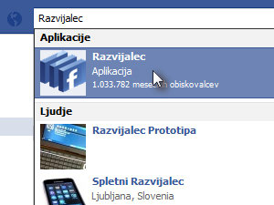 Odprite vaš Facebook profil, v polje za iskanje vpišite Razvijalec in odprite aplikacijo (glej sliko).