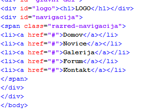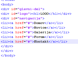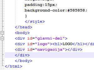 ![]() Zdaj ustvarimo div z imenom glavni-del, v katerem se bo nahajal prostor za logotip, navigacijo in tekstovni del. |