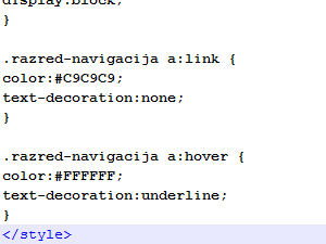 Ker povezave še ne zgledajo dobre, jih bomo malo spremenili s tem, da ustvarimo dva razreda. V prvem razredu ustvarimo lastnosti za povezavo, ki ni prekrita z miškinim kazalcem. Barva je malo temnejša od bele, povezava pa ni podčrtana, ni ležeča in ni odebeljena. |