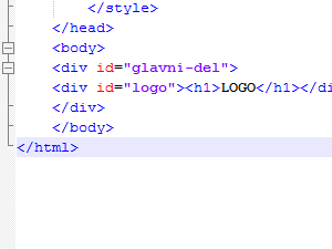 V telo kode vstavimo del logo. Tokrat ga vstavimo v div, ki smo ga ustvarili v 4. In 5. koraku, torej v div glavni-del. LOGODodali smo mu še besedilo, označeno kot glavni naslov. |