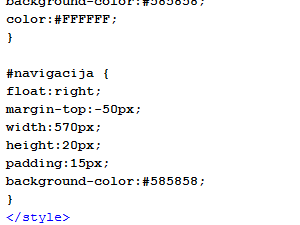 Zdaj je na vrsti navigacija. #navigacija { Postavimo jo na desno stran glavnega dela, jo dvignemo za 50px, nastavimo širino in višino. Tekst bo od roba navigacije odmaknjen vsaj 15 px, ozadje pa bo temno-sivo. |