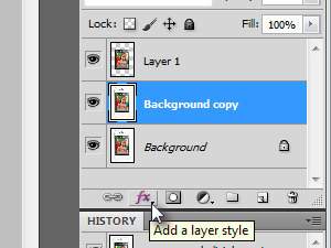 Dupliciran prvotni layer naj ostane označen. Potem pa kliknite na Add a layer style (glej sliko) ... |