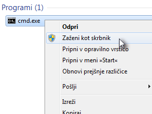 Sedaj kliknemo z desnim miškinim gumbom na cmd.exe in program zaženemo kot skrbnik.