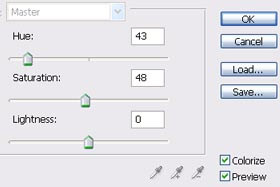Označite Colorize. Potem pa nastavite Hue 43, Saturation 48 in Lightness 0. Seveda se malce sami poigrajte z nastavitvami. Kliknite na gumb OK. |