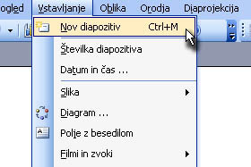 Kliknite na Vstavljanje in izberite Nov diapozitiv (bližnjica sta tipke Ctrl + M).