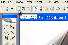Kliknite na izbirnik prve barve (set foreground color) in v polje # vpišite d3bc46 ter potrdite na gumb OK. Žal tega v sliki nisem pokazal, vendar mislim, da ne boste imeli težav. Zgoraj v orodni vrstici določite Shape layers (glej sliko). |