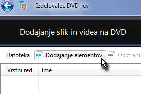 Odpre se Izdelovalec DVD-jev. Sedaj bomo dodali material, ki ga želimo predvajati...